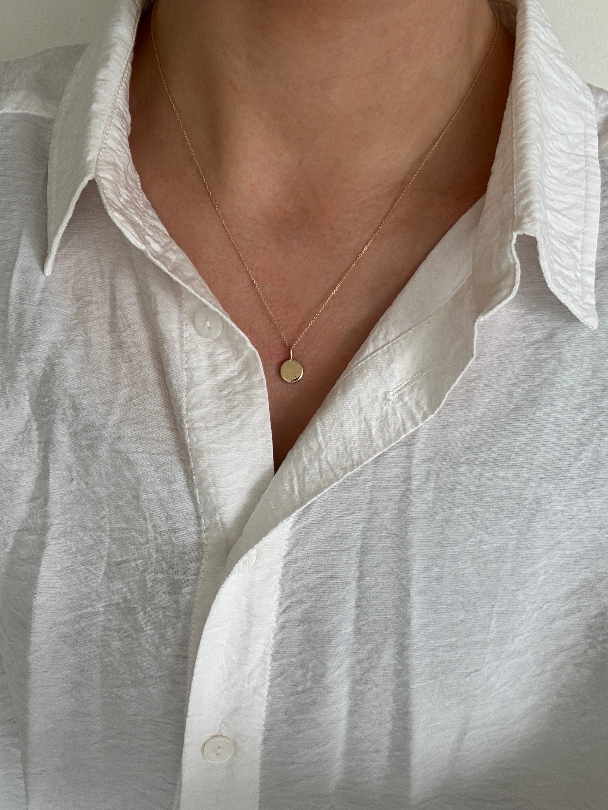 This delicate gold disc necklace is handmade from recycled 9ct gold and is the perfect piece to wear everyday.