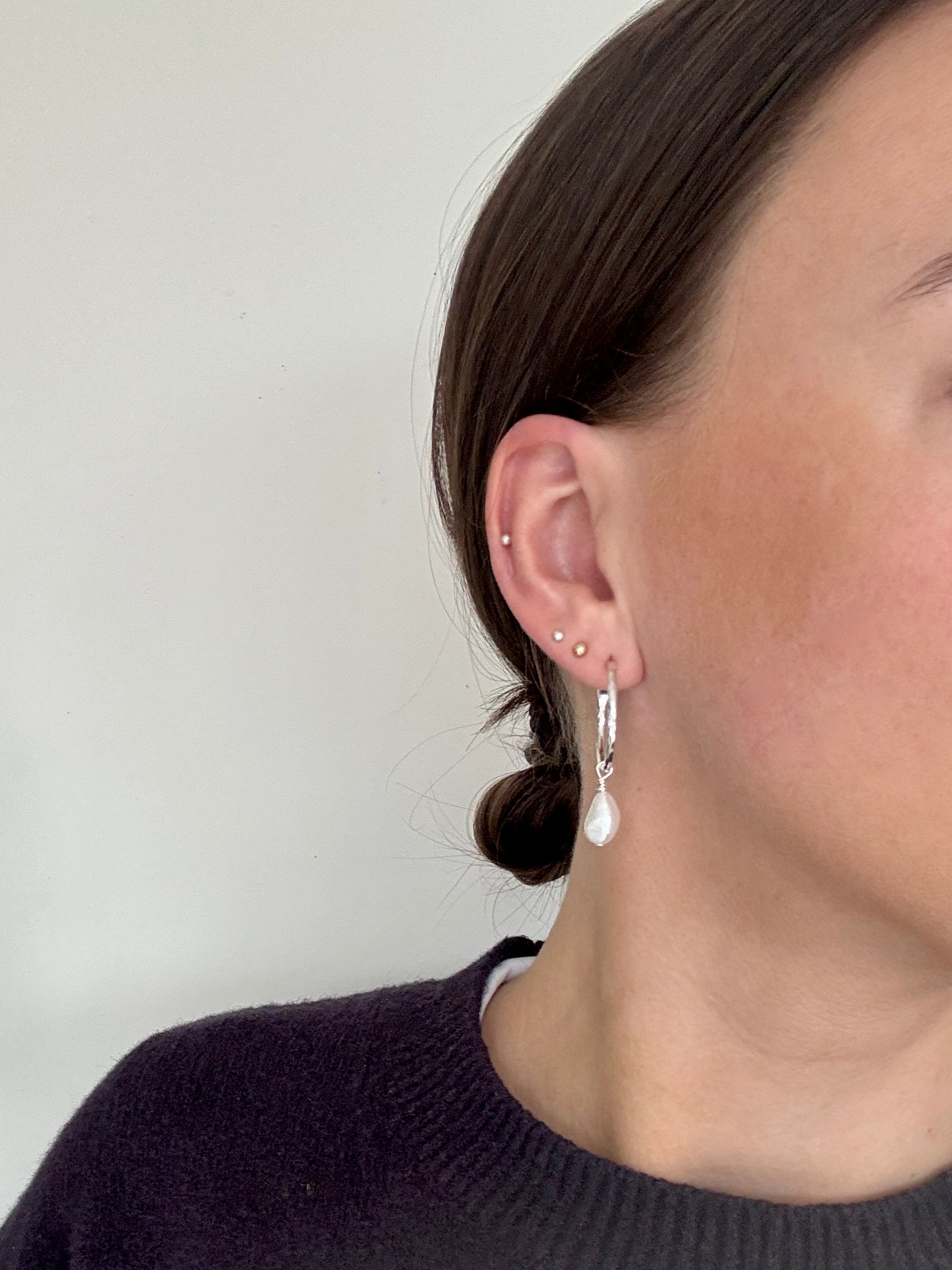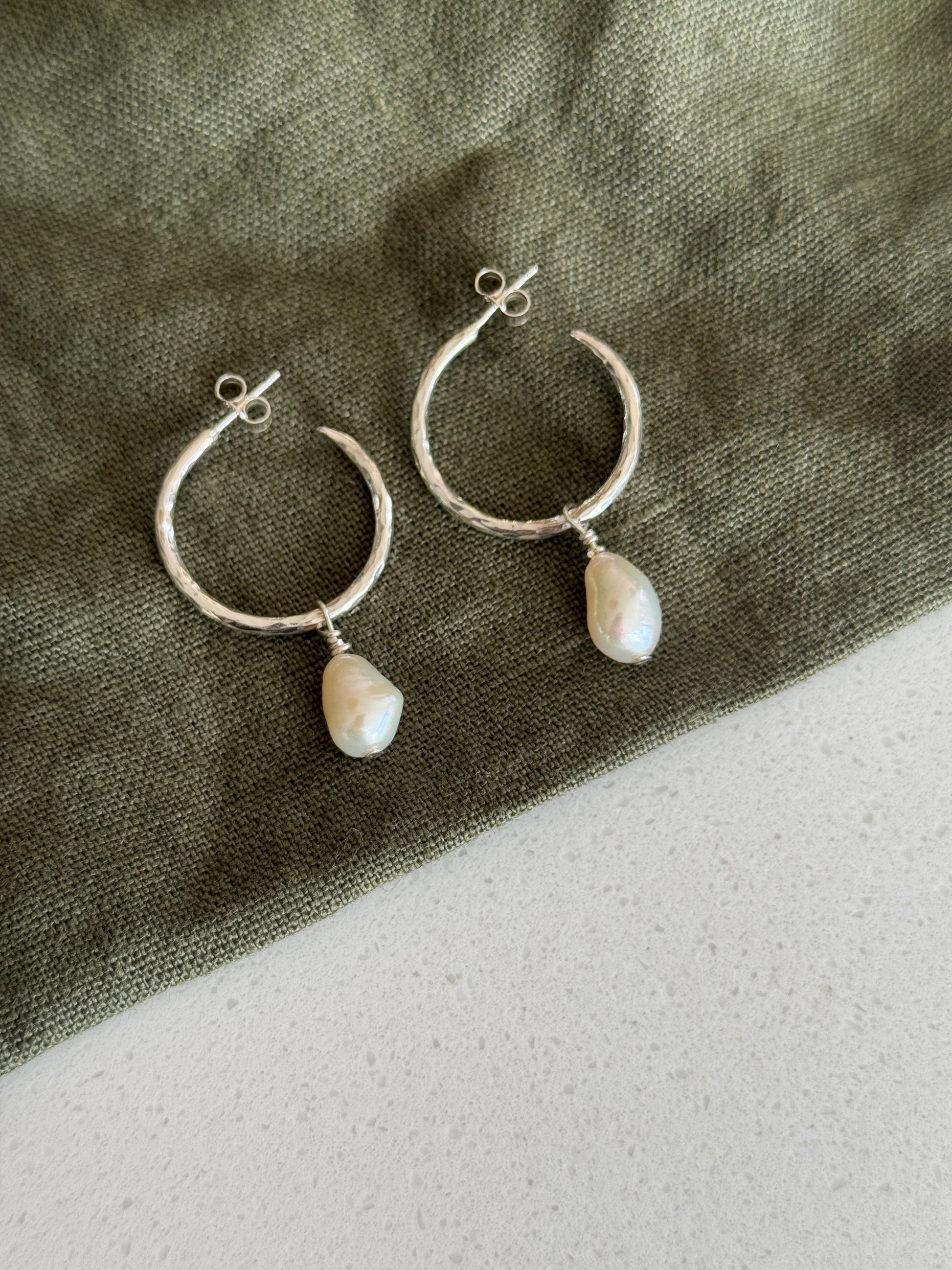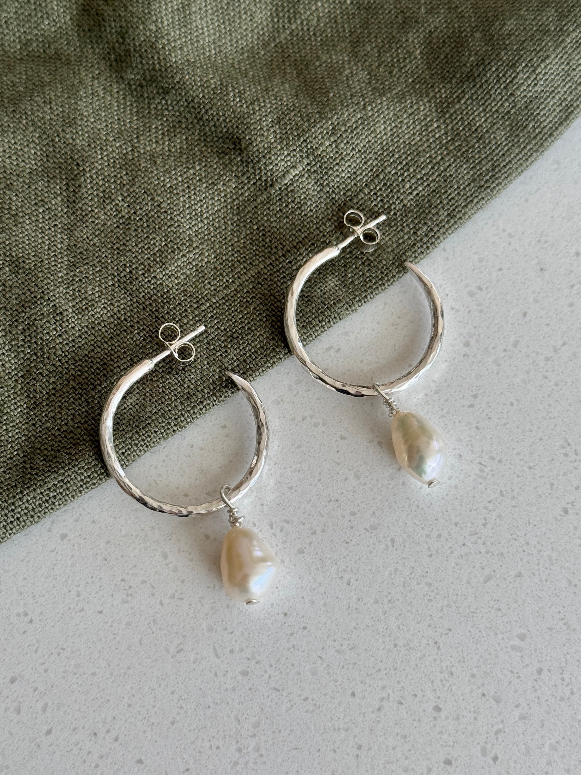 A beautiful pair of hammered sterling silver hoop earrings with freshwater pearl charm.