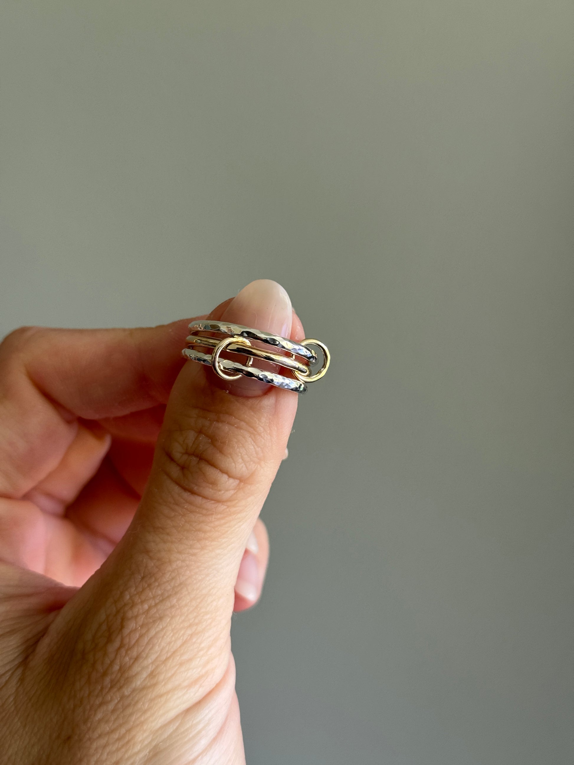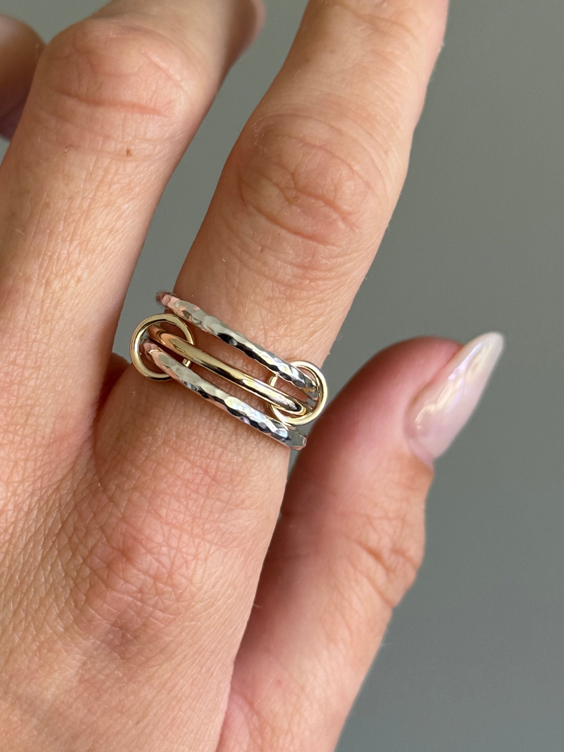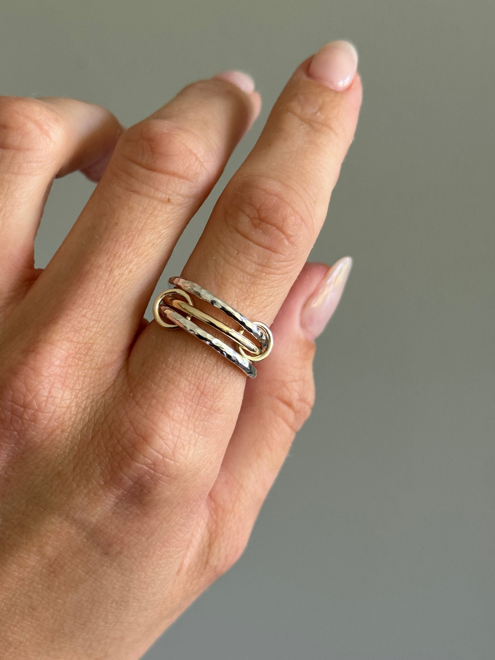Crafted from recycled sterling silver and 9ct gold, this ring features three bands that are connected together with two small hoops. The silver bands have a hammered finish and the gold band has a smooth polished finish, creating a unique contrast in texture.