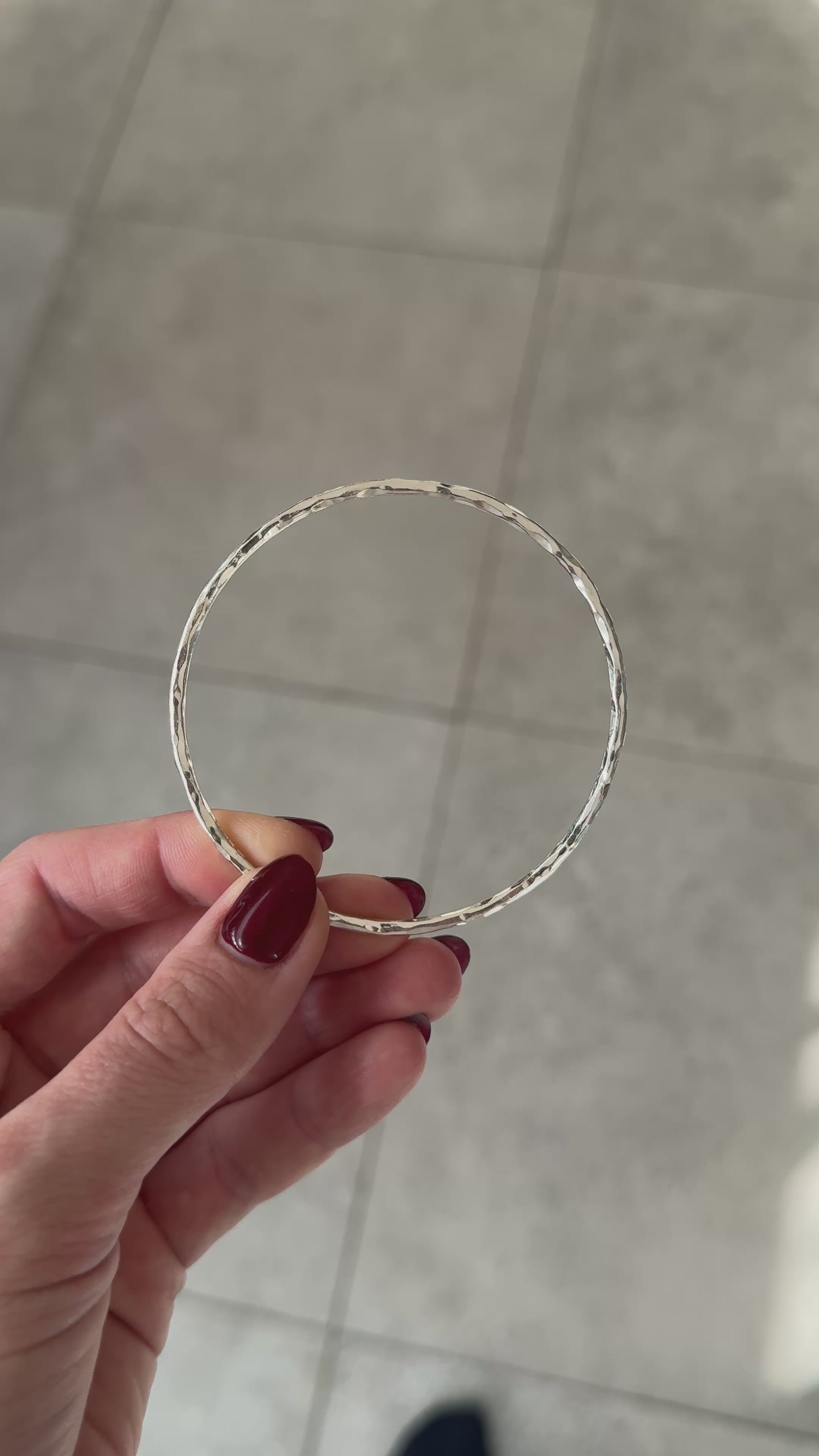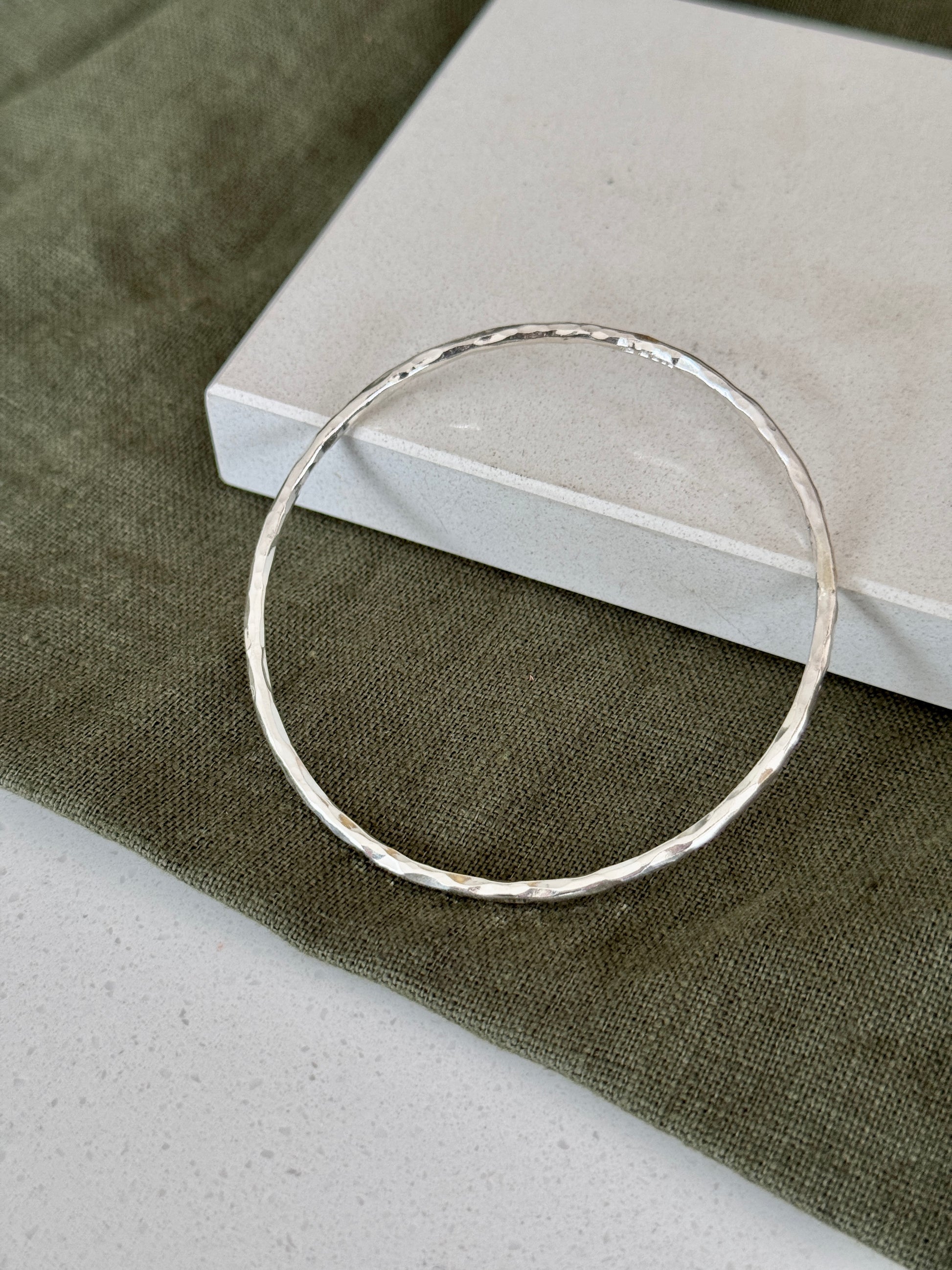 Round solid sterling silver handcrafted bangle with a hammered finish - a signature S&R design.