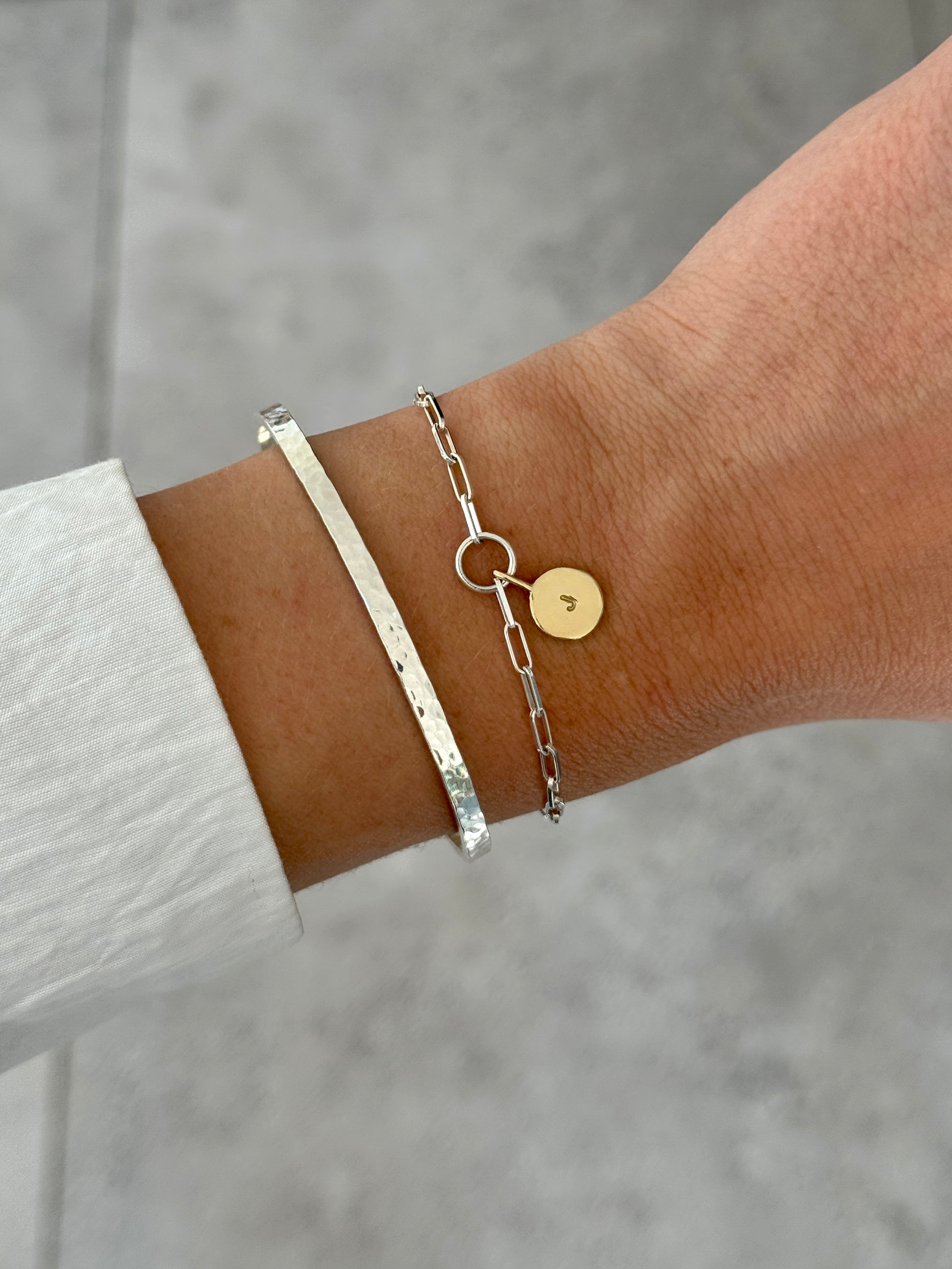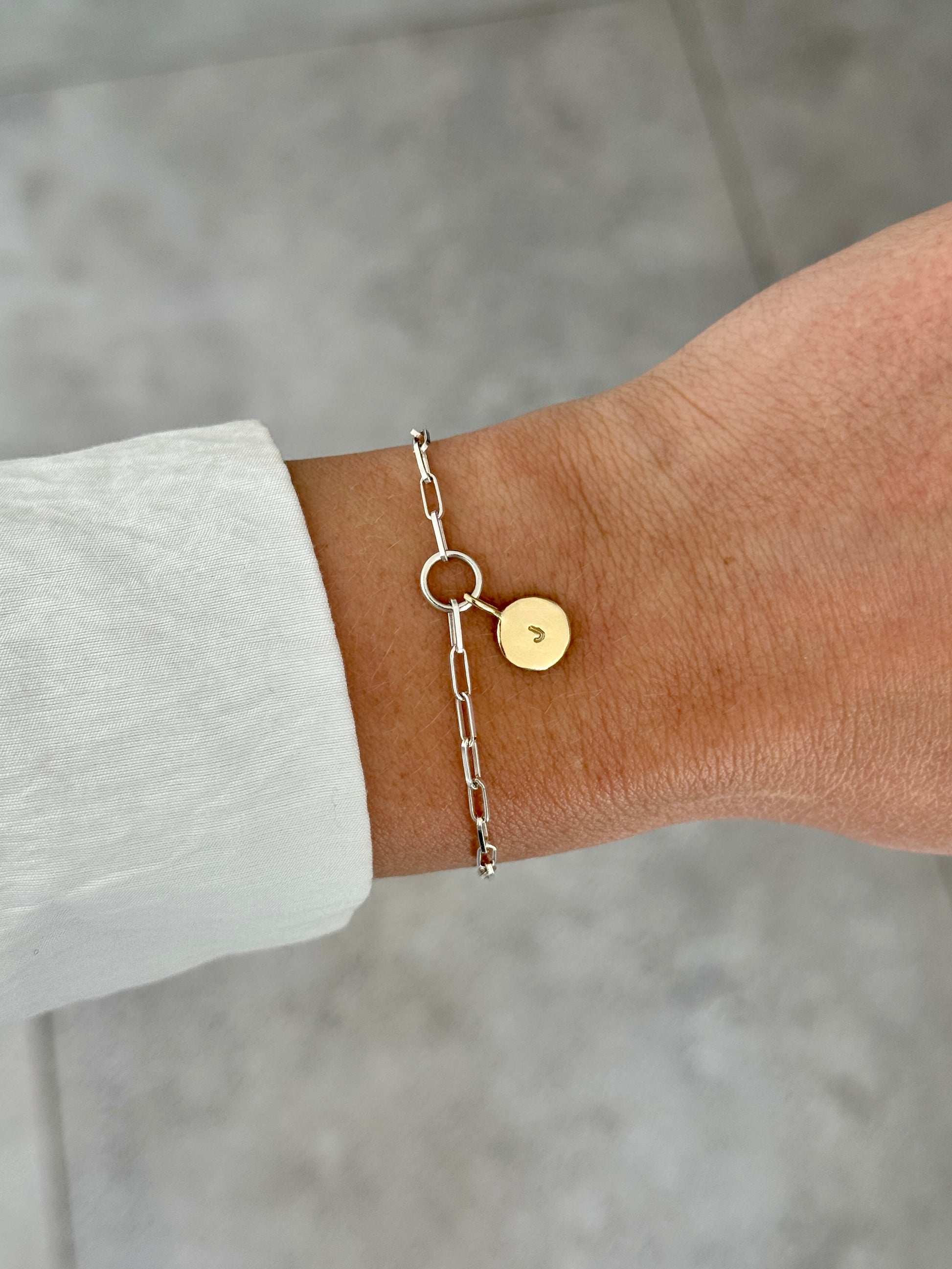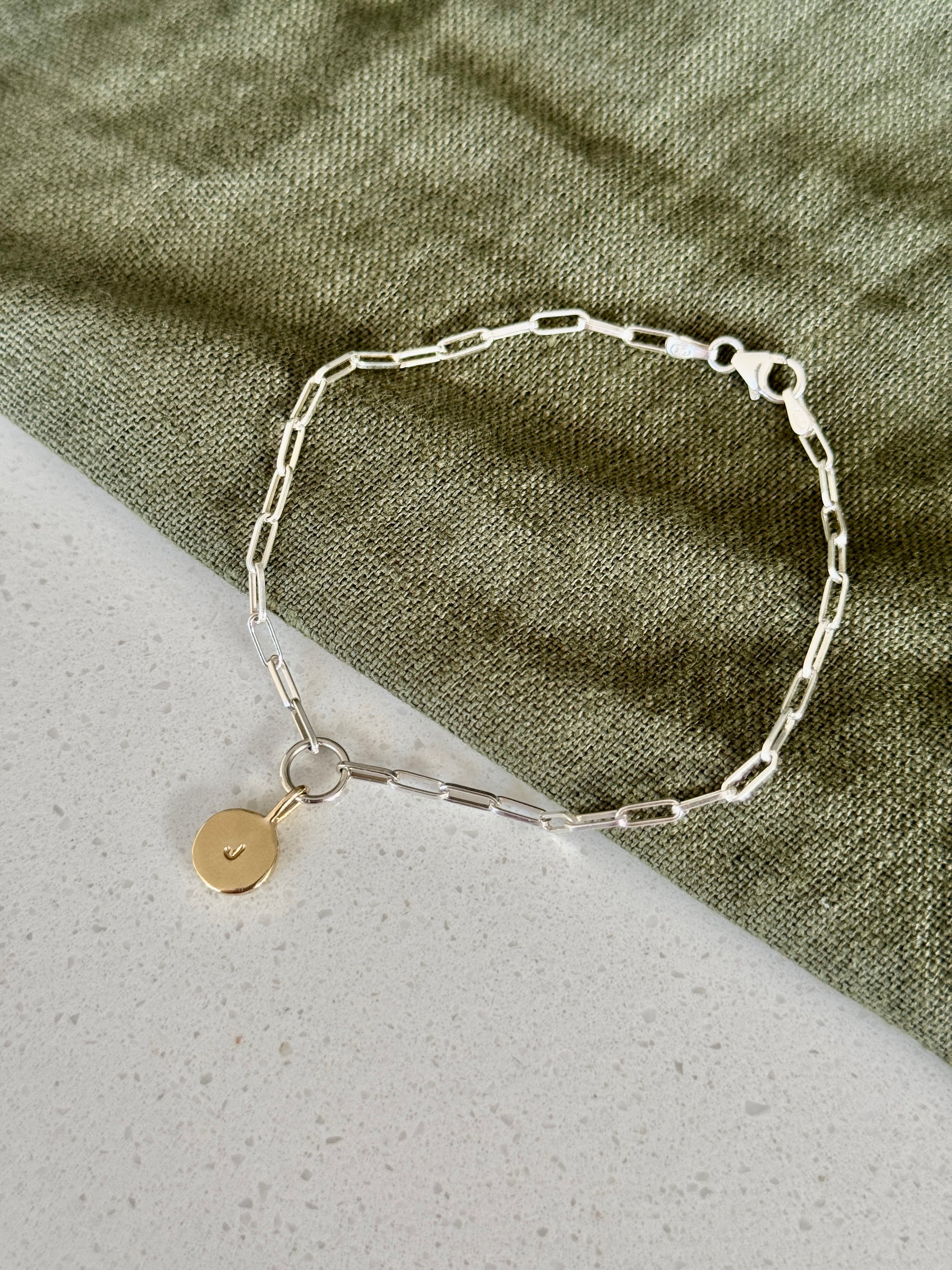 This delicate mixed metal bracelet consists of a sleek sterling silver chain paired with a solid 9ct gold initial charm. Perfect for everyday wear, layering, or gifting someone special.
